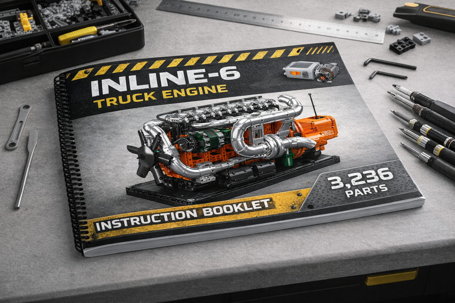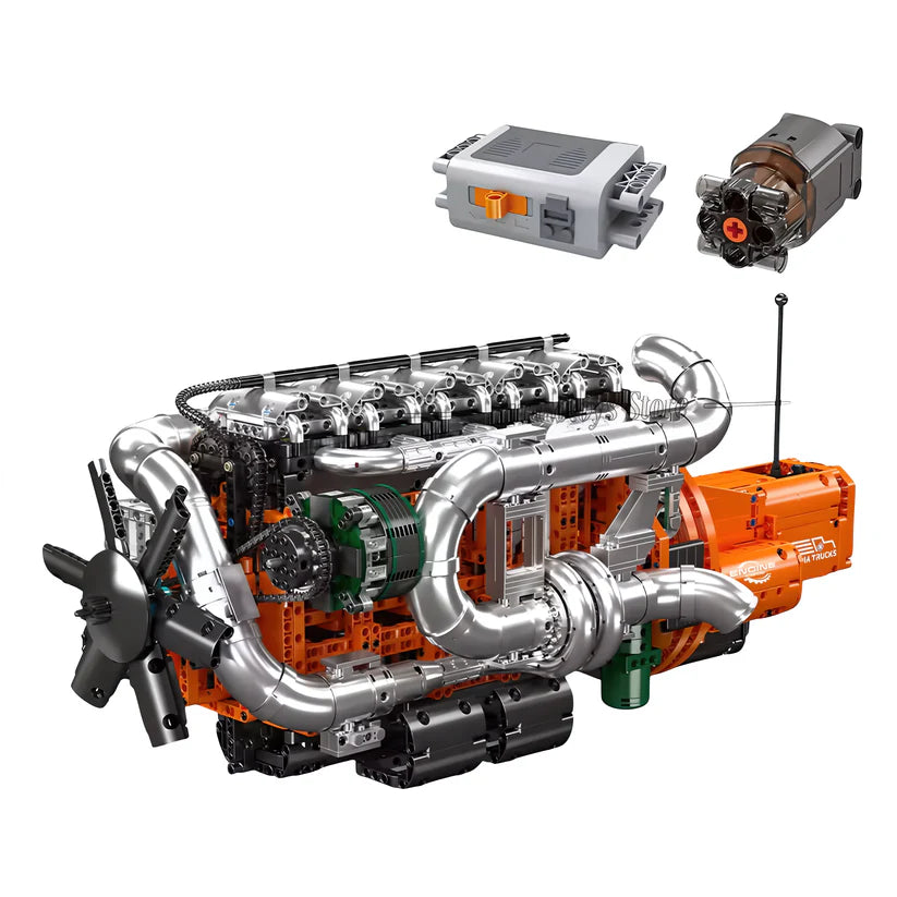 This motorized inline-6 diesel truck engine model is built to replicate the scale and mechanics of a heavy-duty truck engine. Constructed from 3,236 pieces, it features six pistons moving in sequence, a working crankshaft, and a full inline-six layout that can be driven by hand or powered by the included electric motor. Detailed components such as twin turbochargers, exhaust manifolds, and cooling systems are integrated into the build, allowing you to clearly see how a diesel engine operates. Designed as a large, challenging build, it doubles as a realistic display model that demonstrates industrial engine mechanics in motion.