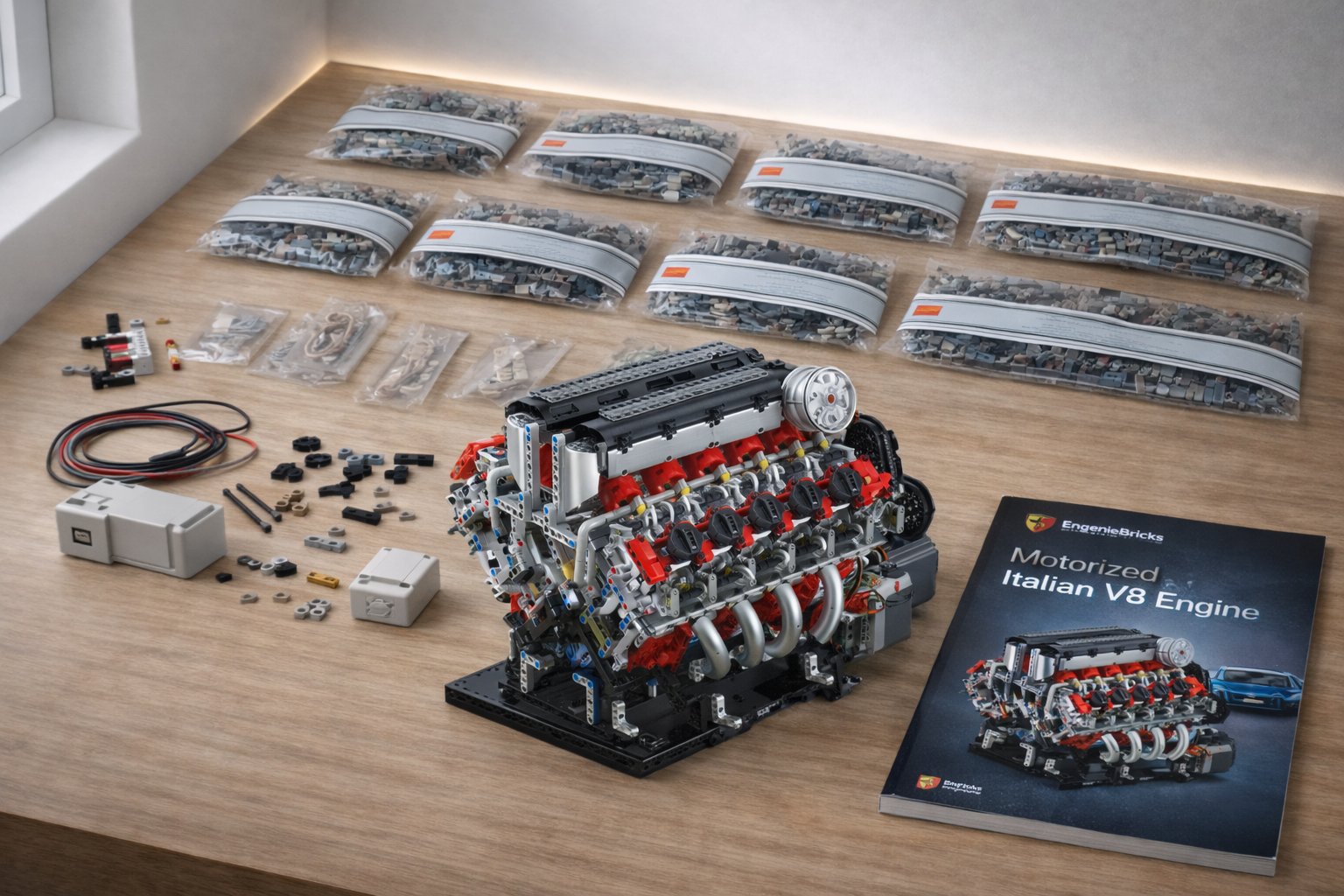 The Motorized Italian V8 Engine by EngineBricks is a large-scale, highly detailed model that celebrates the precision and performance of iconic Italian supercar engineering. Built from over 2,700 pieces, it features eight rotating pistons, a twin-turbo system, and a fully realized valvetrain that bring the engine’s mechanics to life. Dual timing chains, crankshaft and camshaft pulleys, and an adjustable chain tensioner showcase how power is precisely controlled and delivered. Powered by an extra-large electric motor and rechargeable battery pack, the engine runs smoothly with adjustable speed control for lifelike motion. Designed as both an immersive build and a striking display, it blends mechanical artistry with hands-on engineering insight.